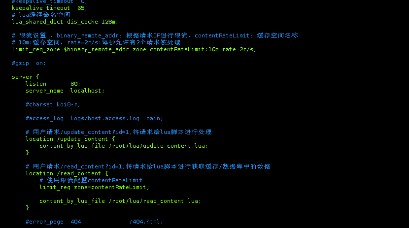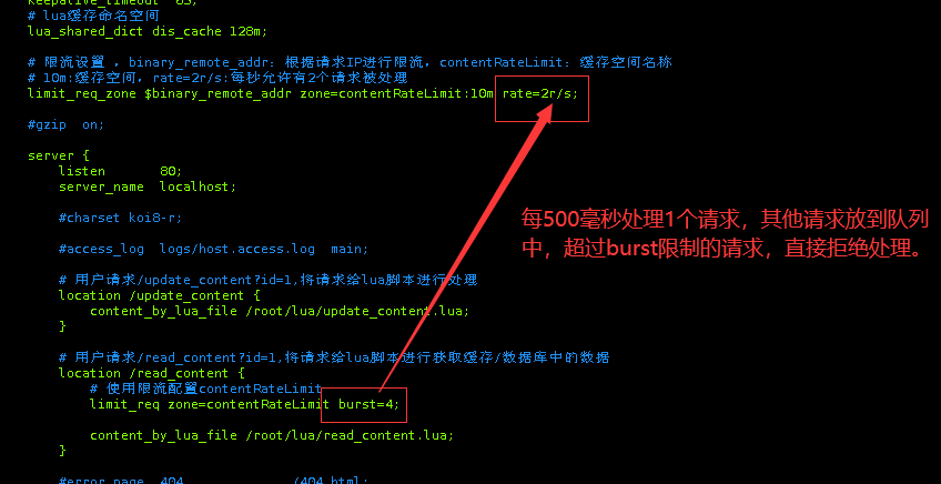 | server {     listen       80;     server_name  localhost;     location /update_content {         content_by_lua_file /root/lua/update_content.lua;     }     location /read_content {         limit_req zone=contentRateLimit burst=4;         content_by_lua_file /root/lua/read_content.lua;     } }