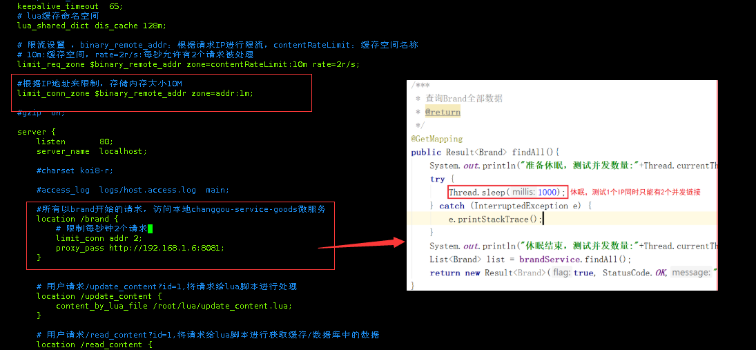 | http {     include       mime.types;     default_type  application/octet-stream;          lua_shared_dict dis_cache 128m;          limit_req_zone $binary_remote_addr zone=contentRateLimit:10m rate=2r/s;          limit_conn_zone $binary_remote_addr zone=addr:1m;     sendfile        on;               keepalive_timeout  65;          server {         listen       80;         server_name  localhost;                  location /brand {             limit_conn addr 2;             proxy_pass http://192.168.1.6:8081;         }         location /update_content {             content_by_lua_file /root/lua/update_content.lua;         }         location /read_content {             limit_req zone=contentRateLimit burst=4 nodelay;             content_by_lua_file /root/lua/read_content.lua;         }     } }