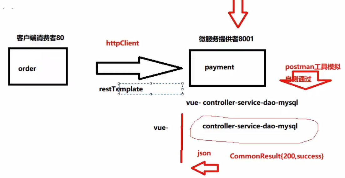 Controller 1 2 3 4 5 6 7 8 9 10 11 12 13 14 15 16 17 18 19 20 21 22 23 @RestController @Slf4j public class OrderController { public static final String PAYMENY_URL = "http://localhost:8001" ; @Resource private RestTemplate restTemplate; @PostMapping("customer/payment/create") public CommonResult<Payment> create (Payment payment) { return restTemplate.postForObject(PAYMENY_URL + "/payment/create" , payment, CommonResult.class); } @GetMapping("customer/payment/{id}") public CommonResult<Payment> getPaymentById (@PathVariable("id") Long id) { return restTemplate.getForObject(PAYMENY_URL + "/payment/" + id, CommonResult.class); } }