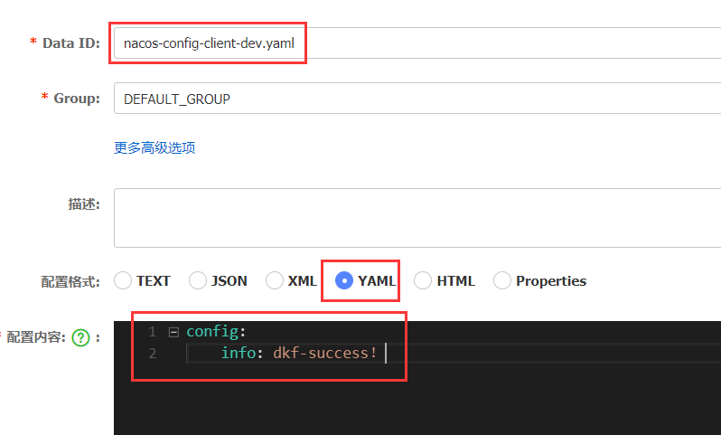 去nacos上创建一个dataid ,名字和yml配置的一致,json格式,内容如下: