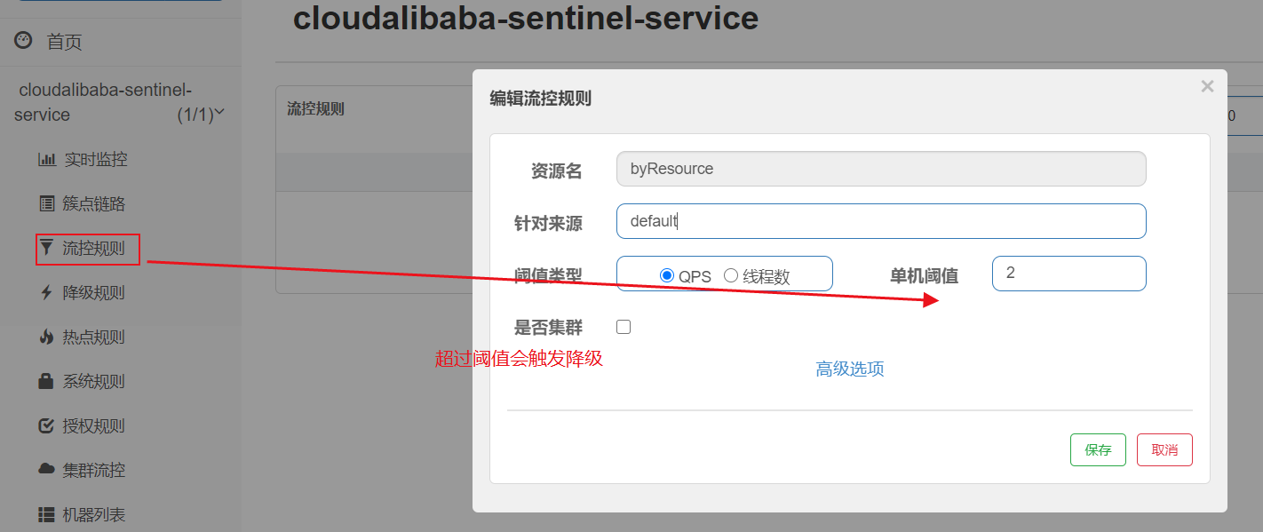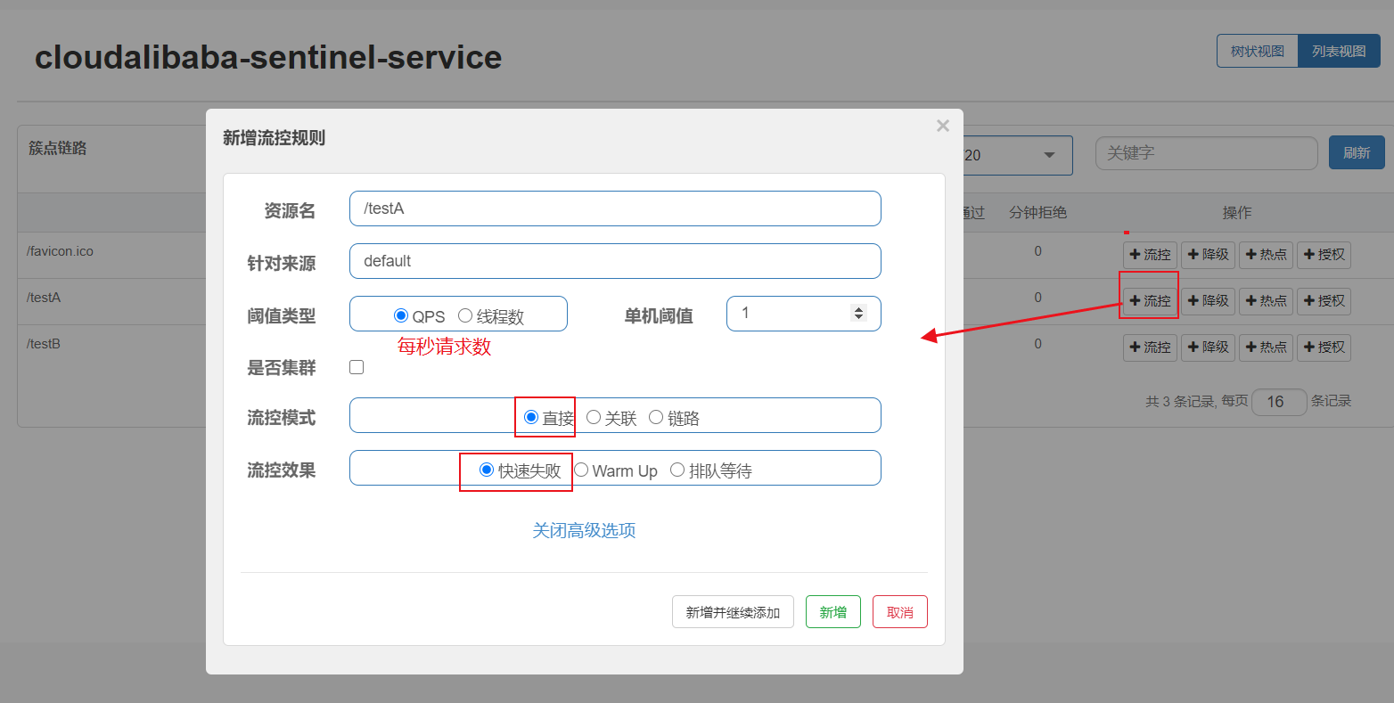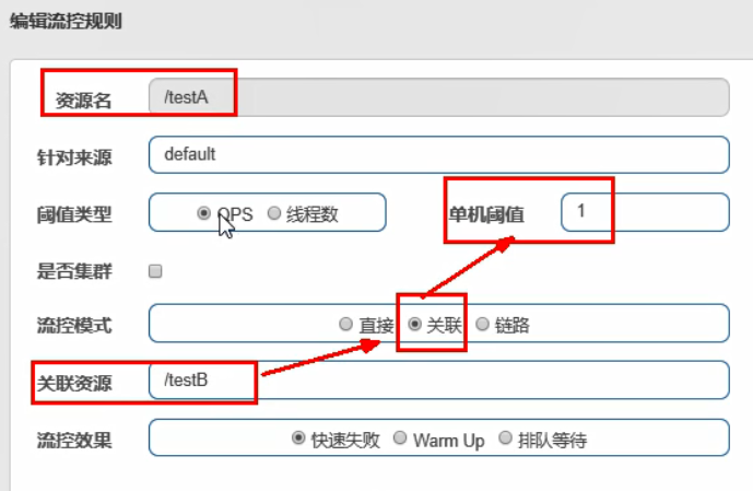 resource:资源名称 limitApp:来源应用 grade:阈值类型,0表示线程数,1表示QPS, count:单机阈值, strategy:流控模式,0表示直接,1表示关联,2表示链路
