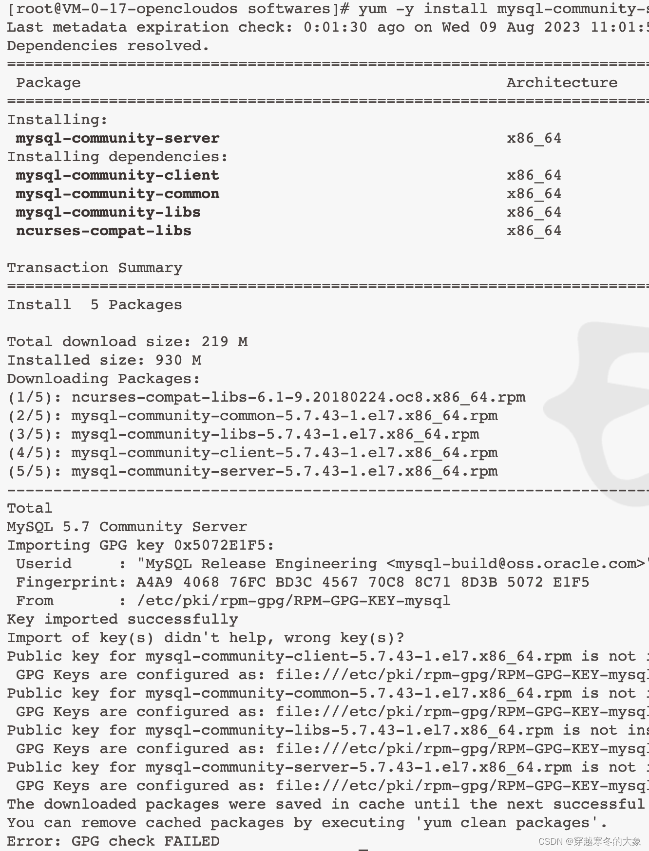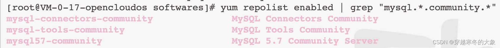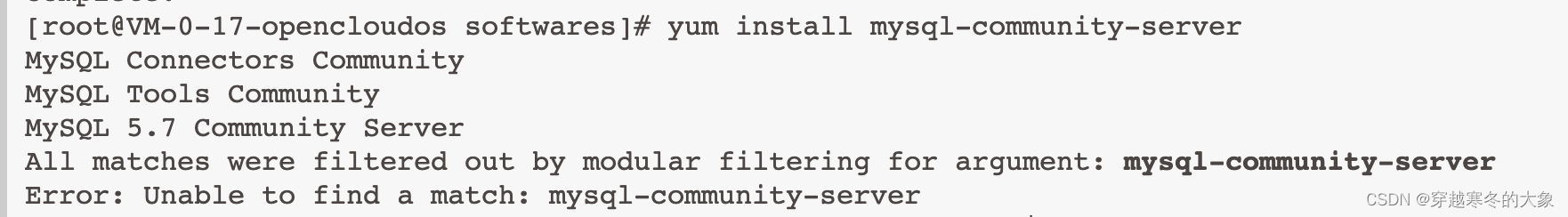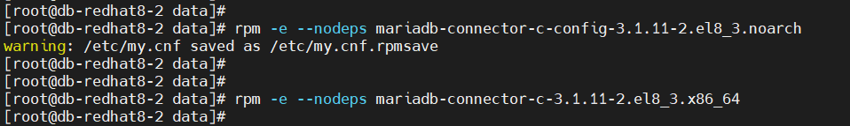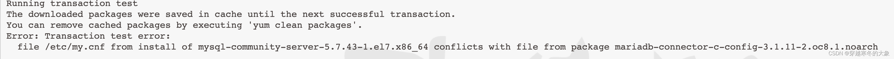 报错:Error: Transaction test error: file /etc/my.cnf from install of mysql-community-server 问题描述 在安装MySQL过程中出现错误 file /etc/my.cnf from install of mysql-community-server-xxx conflicts with file from package mariadb-connector-c-config-xxx.noarch提示。