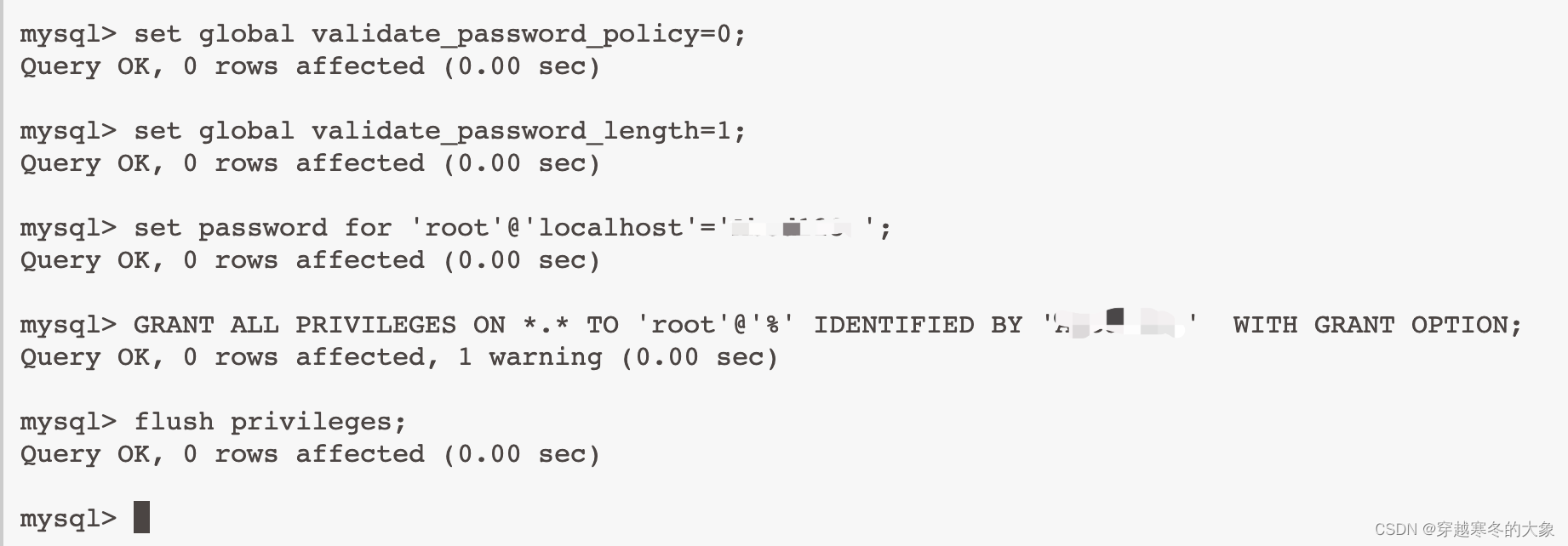 # 如果想要密码规则简单一点,可以修改两个全局参数(可以不用设置) set global validate_password_policy=0; set global validate_password_length=1; # 设置新密码(需要大写、小写、数字、符号) set password for'root'@'localhost'='你的新密码'; # 设置远程访问 GRANT ALL PRIVILEGES ON *.* TO 'root'@'%' IDENTIFIED BY '你的新密码' WITH GRANT OPTION; # 刷新使配置生效 flush privileges; # 注意最后的;不能去掉