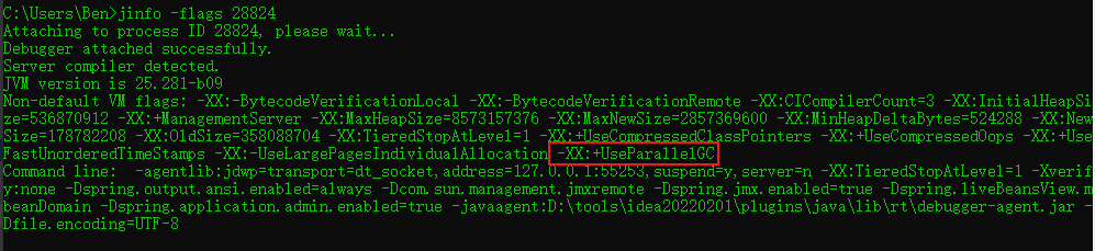 可以通过jinfo -flags 进程号查看对应 Java 程序启动参数,我本地使用的 JDK1.8 默认使用的ParallelGC